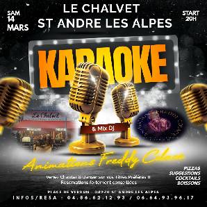 Venez passer un bon moment tout en musique à Le Chalvet à St André Les Alpes le Samedi 14 Mars 2026 à partir de 20h pour un Karaoké Night et Mix Dj ambiance autour d'un bon repas à la Carte, Pizzas, Suggestion du Jour !!!