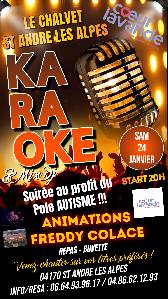 Venez passer un bon moment tout en musiques et en chansons au profit du pole Autisme en partenariat avec Coeur Lavande JEan Tripodi, Le Chalvet avec Serge et Animations Freddy Colace à St André Les Alpes le Samedi 24 Janvier 2026 à partir de 19h30 pour un Karaoké Night et Mix Dj ambiance autour d'un bon repas et buvette sur place !!!